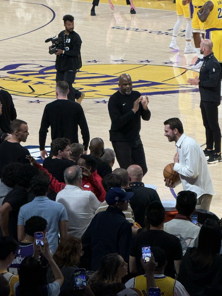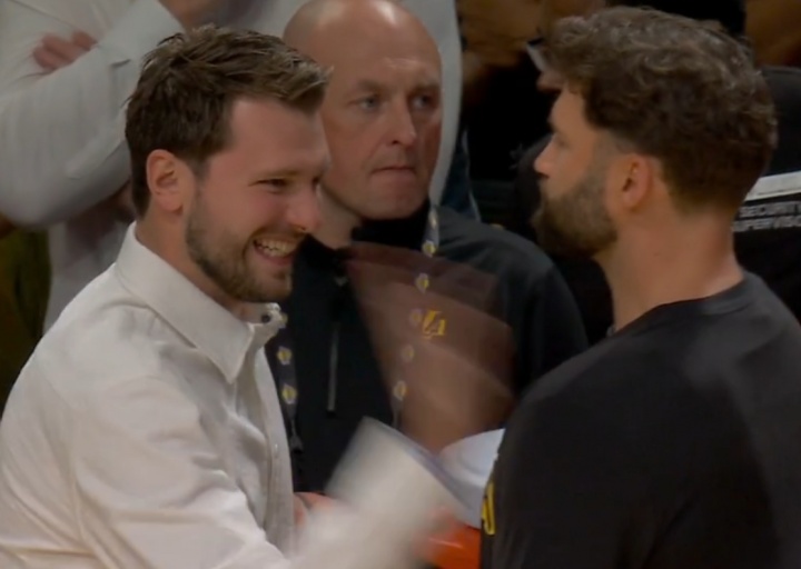 保持手感!东契奇现身板凳席 抱着个球跟队友们一一击掌